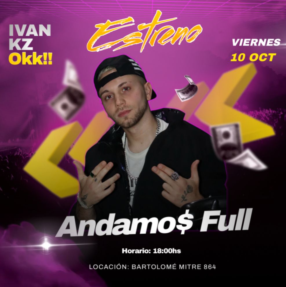 Ivan Kz lanza su nuevo EP "andamo$ full" el domingo 10 de octubre a las 18 en Bartolomé Mitre 864, cerca del Obelisco. El evento reunirá a influencers, youtubers, productores y amigos del artista de 25 años.