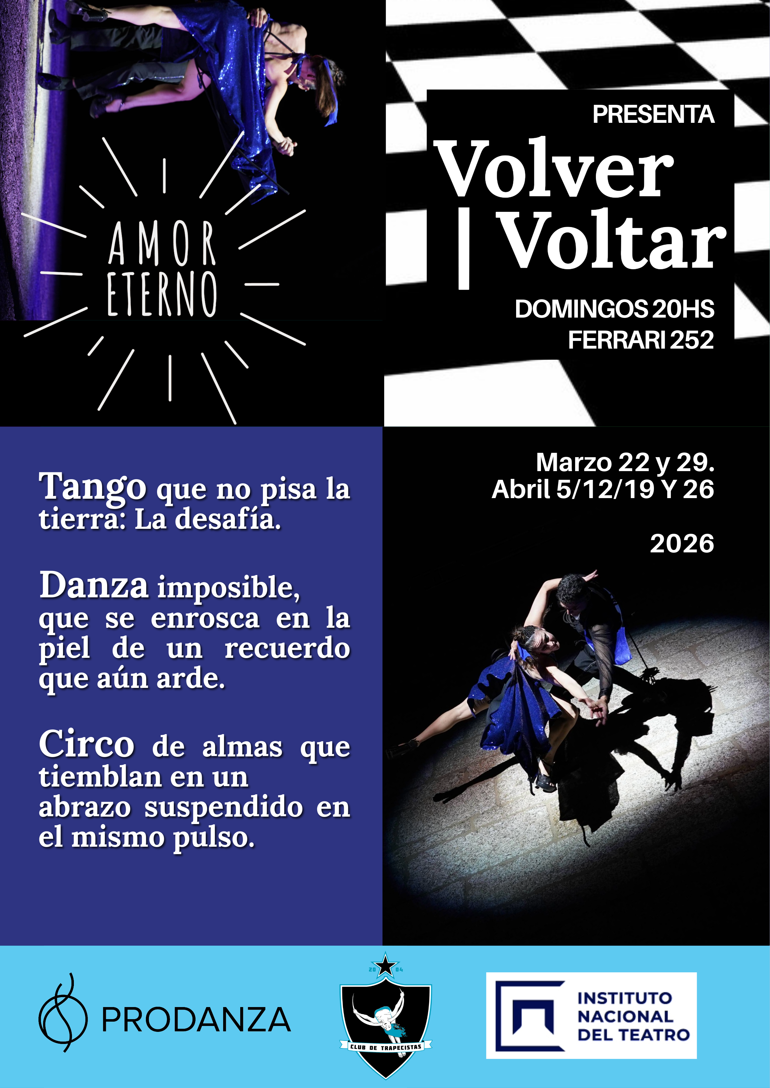 Volver Voltar invita a eso: a volver a un lugar donde el tiempo no corre igual. Uno sale del Club de Trapecistas Estrella del Centenario con la sensación de haber visto algo que no entra en una categoría fácil. No es danza, no es circo, no es tango. Es las tres cosas a la vez, y ninguna del todo. El apoyo del Prodanza y el Instituto Nacional del Teatro respalda una propuesta que merece más que seis domingos. Ojalá vuelva.