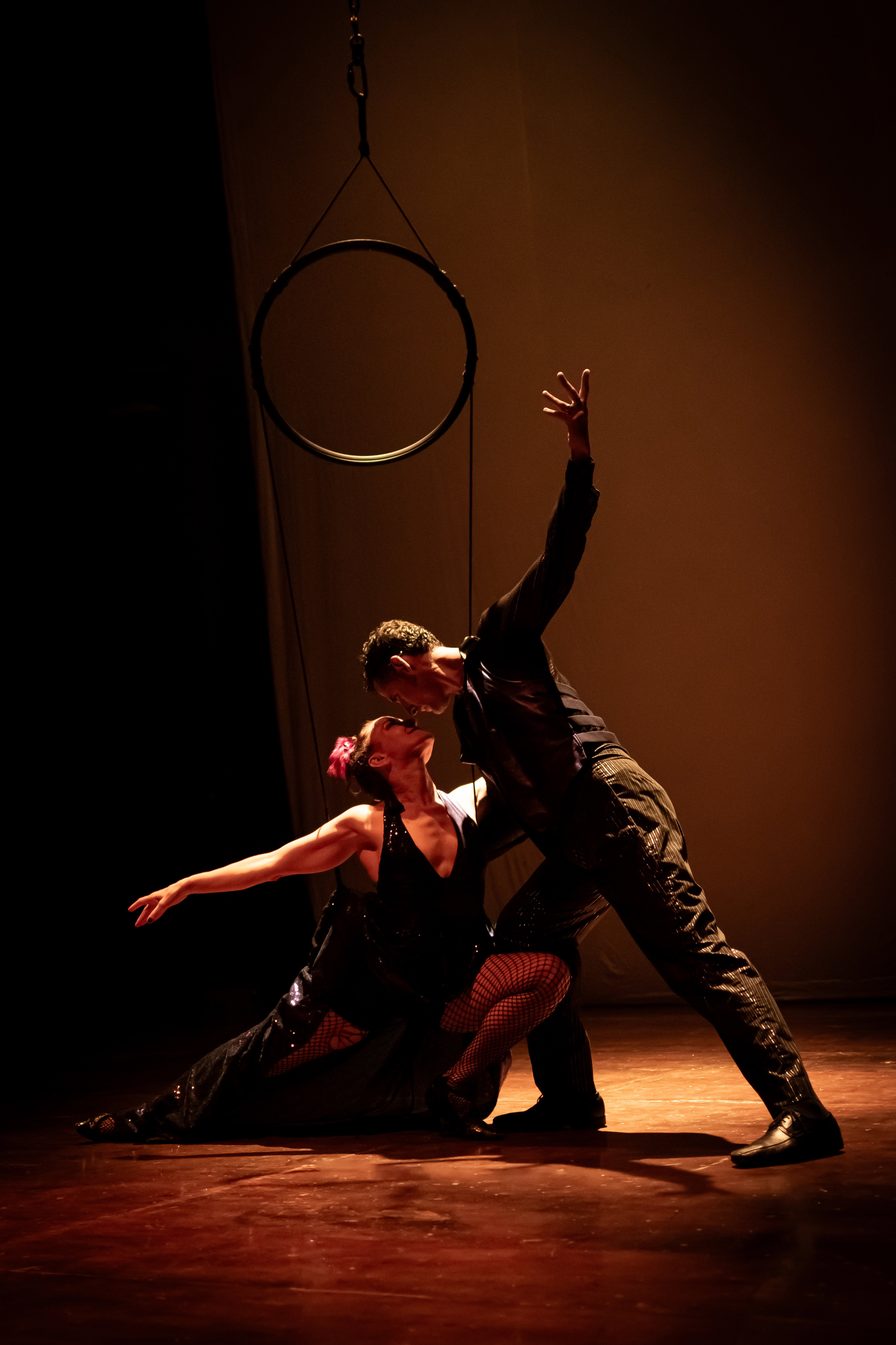 La dirección de Cecilia Gómez marca el pulso de todo el espectáculo. Su mirada construye una atmósfera densa, cargada de imágenes que remiten al tango, sin imitarlo. La propuesta no busca reproducir los códigos clásicos del dos por cuatro: los toma como punto de referencia y los lleva a otro lugar. Hay algo del abrazo tanguero en la relación entre los cuerpos en el aire, en esa tensión entre el peso y la ligereza. Pero el lenguaje es otro. Más contemporáneo, más abierto.